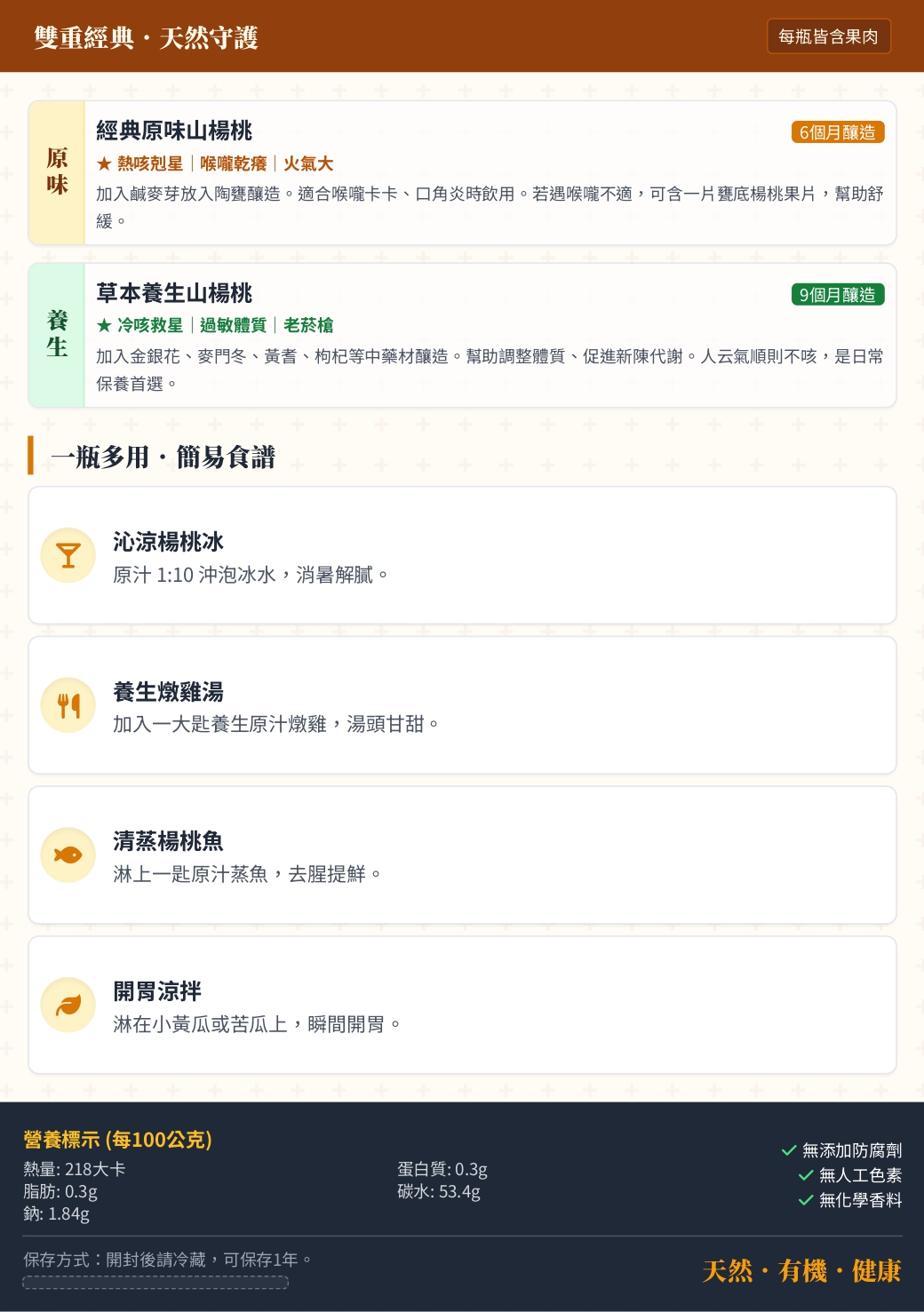 時間淬鍊:陶甕靜釀 9 個月(孕育新生命的長度)。您的守護者: 針對冷咳、過敏體質、以及老菸槍設計。中藥材的溫潤與楊桃的酸甘結合,不僅開胃,更能幫助調節生理機能,促進新陳代謝。氣順了,人就舒服了。
